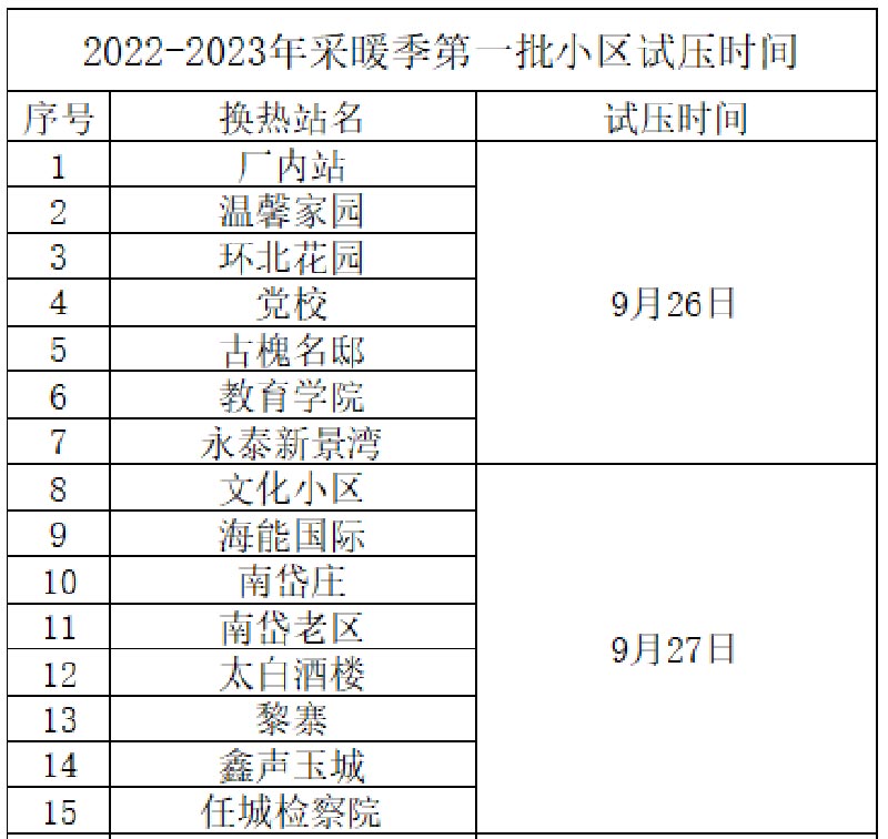 2、為避免發(fā)生漏水情況,建議用戶提前檢查自家供熱設施情況,同時我公司會將各小區(qū)試壓通知提前一周張貼在每個單元樓,請用戶近期留意查看。